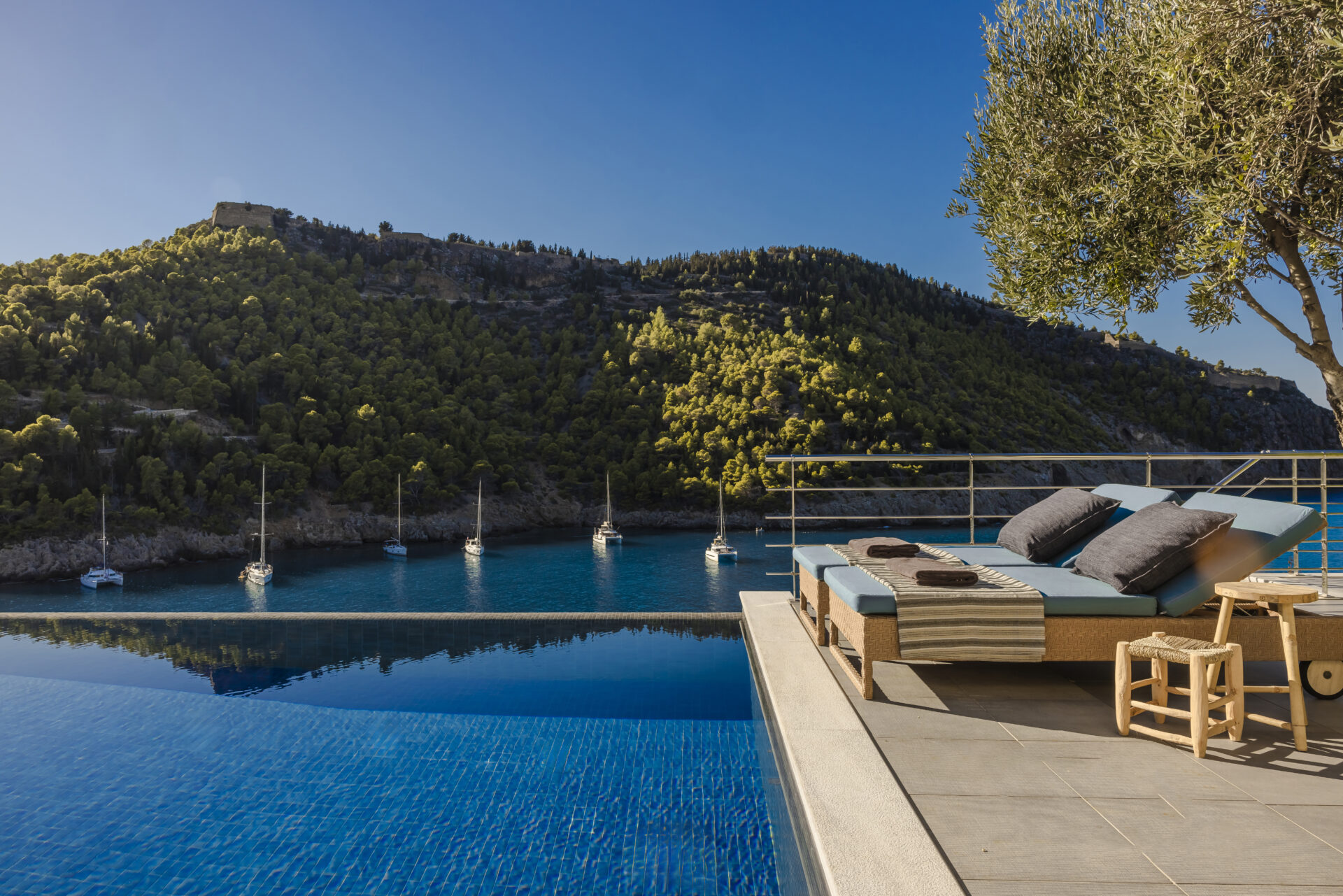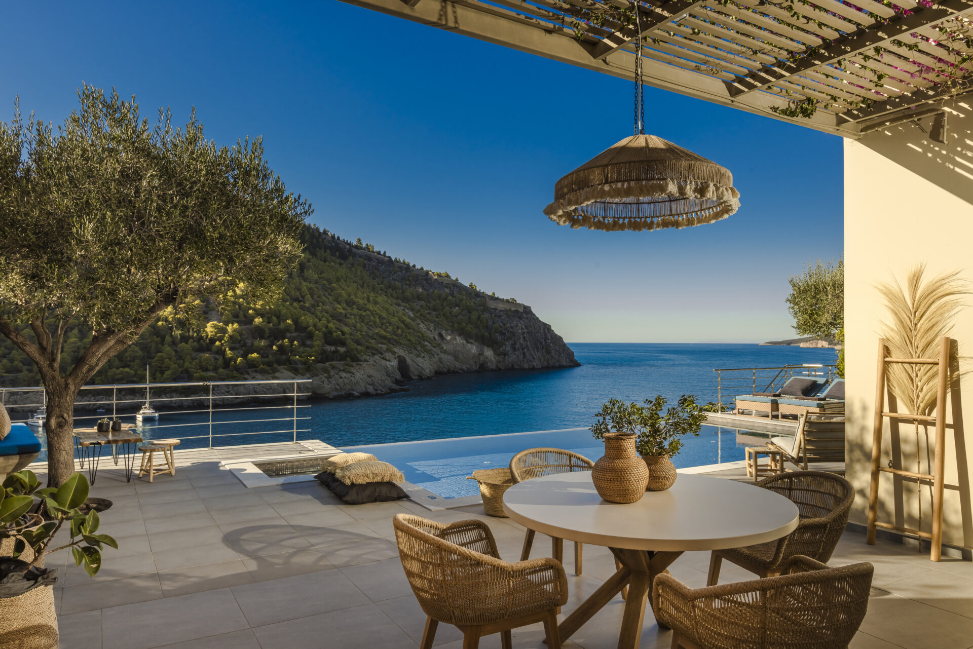 Outdoors, a sparkling private pool invites you to dive into sapphire waters or simply bask in the sun on a plush lounger. For a more adventurous dip, follow the private staircase leading down to a natural rock platform — your own gateway to the crystal-clear Ionian Sea.
