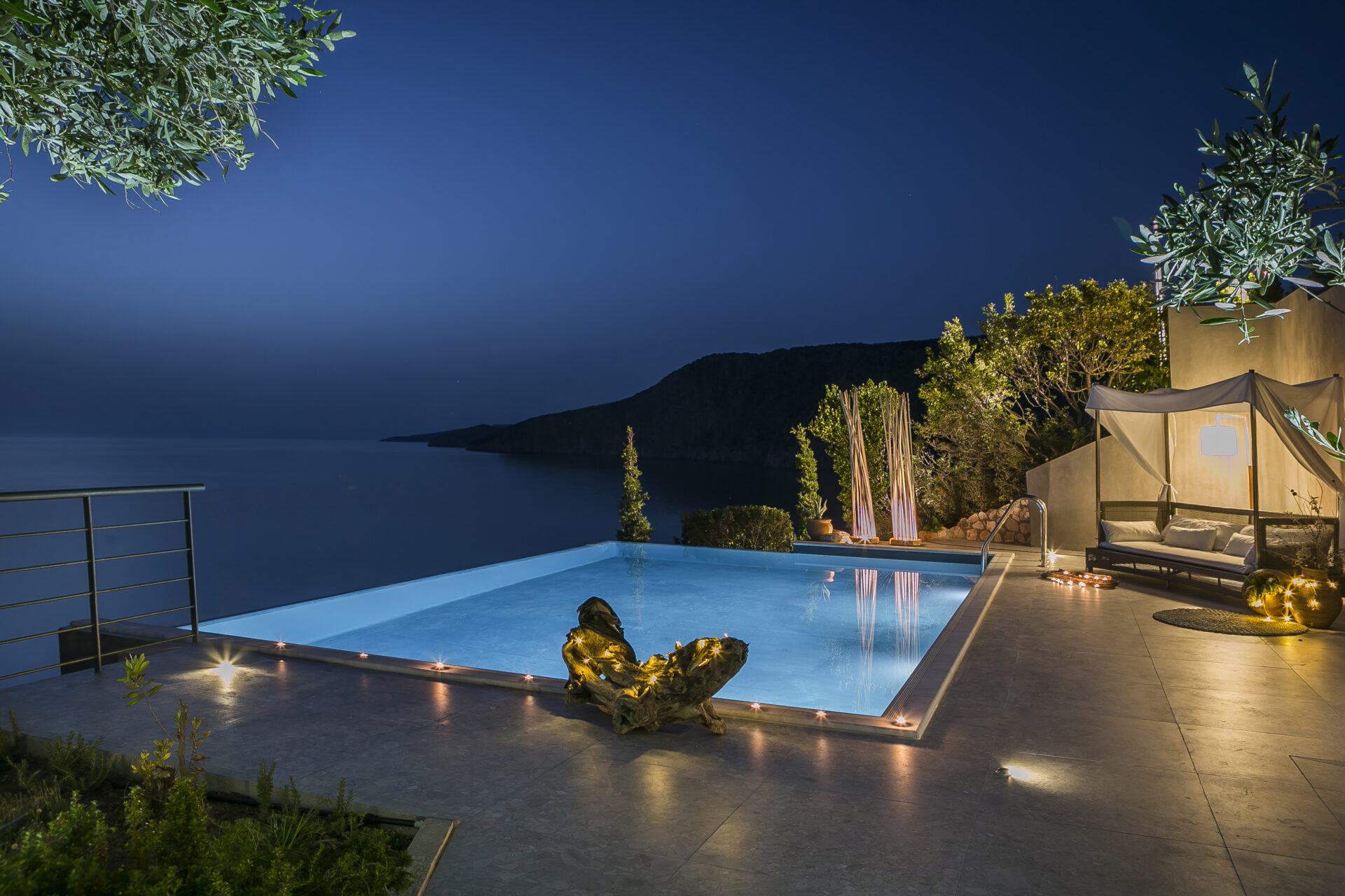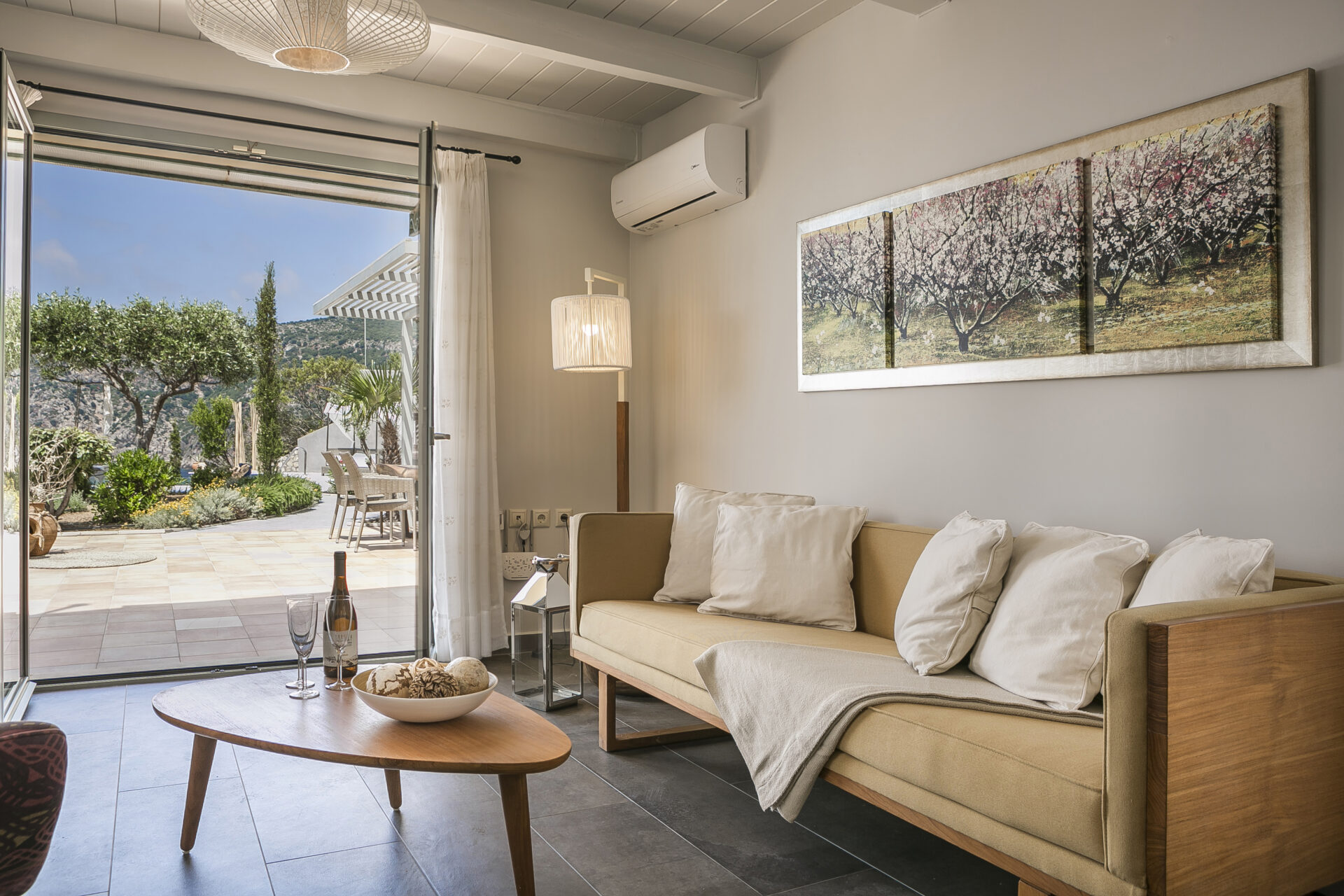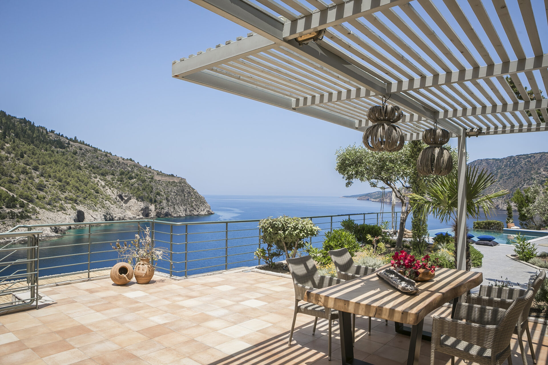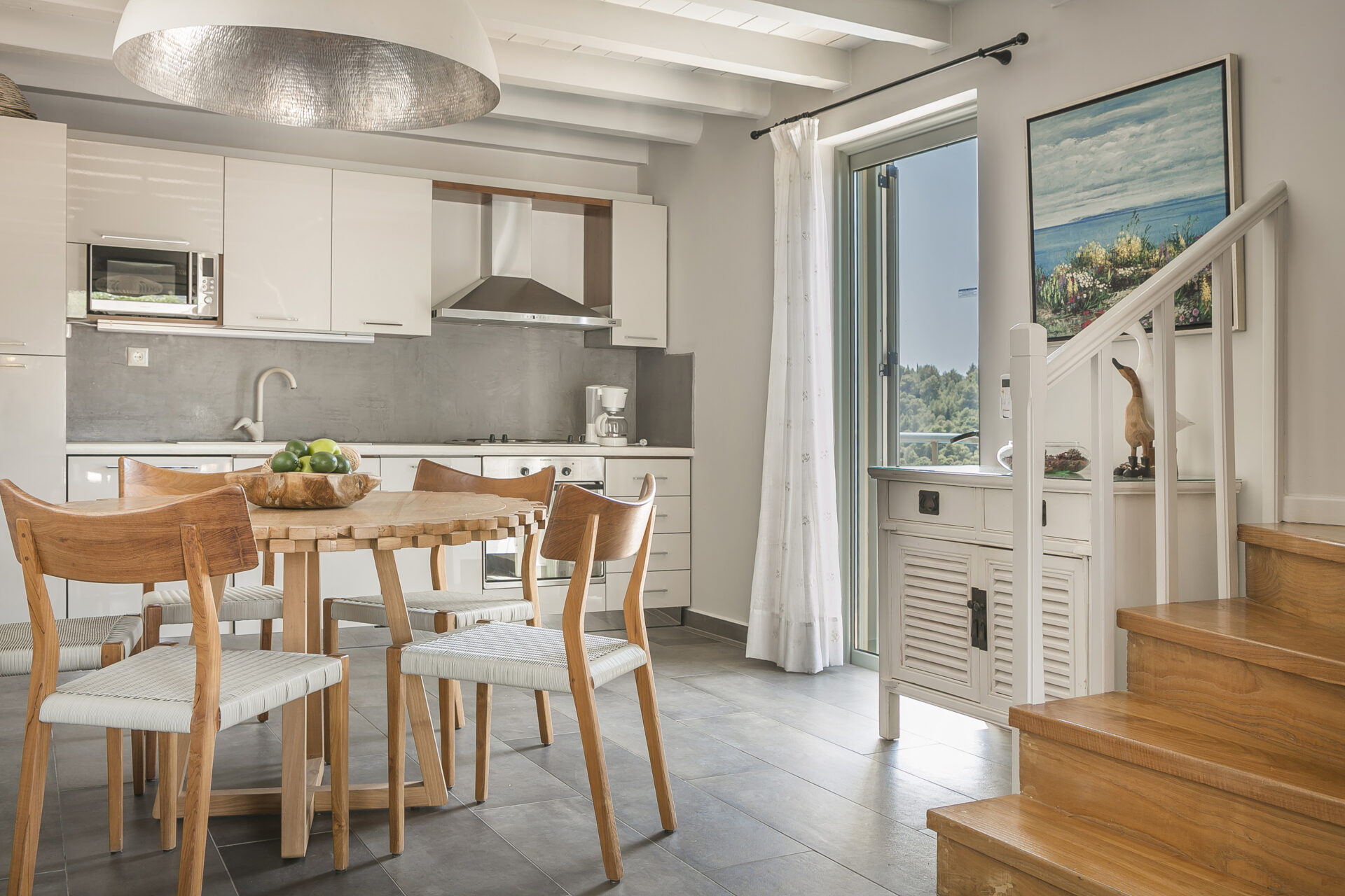 Surrounded by lavender and Mediterranean gardens, Villa Eleni captures the essence of relaxed island living. Its vast terrace invites guests to enjoy breathtaking sunsets followed by moonlit evenings under the Ionian sky. Inside, elegant earthy tones and natural textures create a warm, welcoming atmosphere.