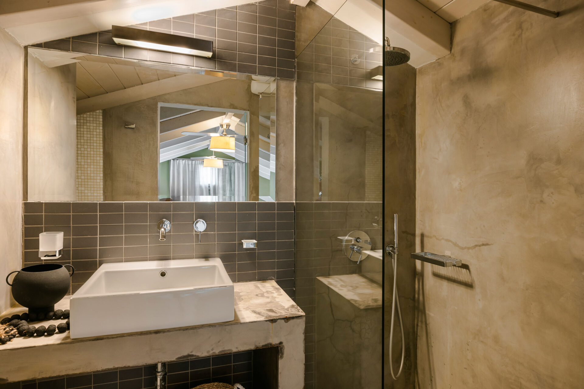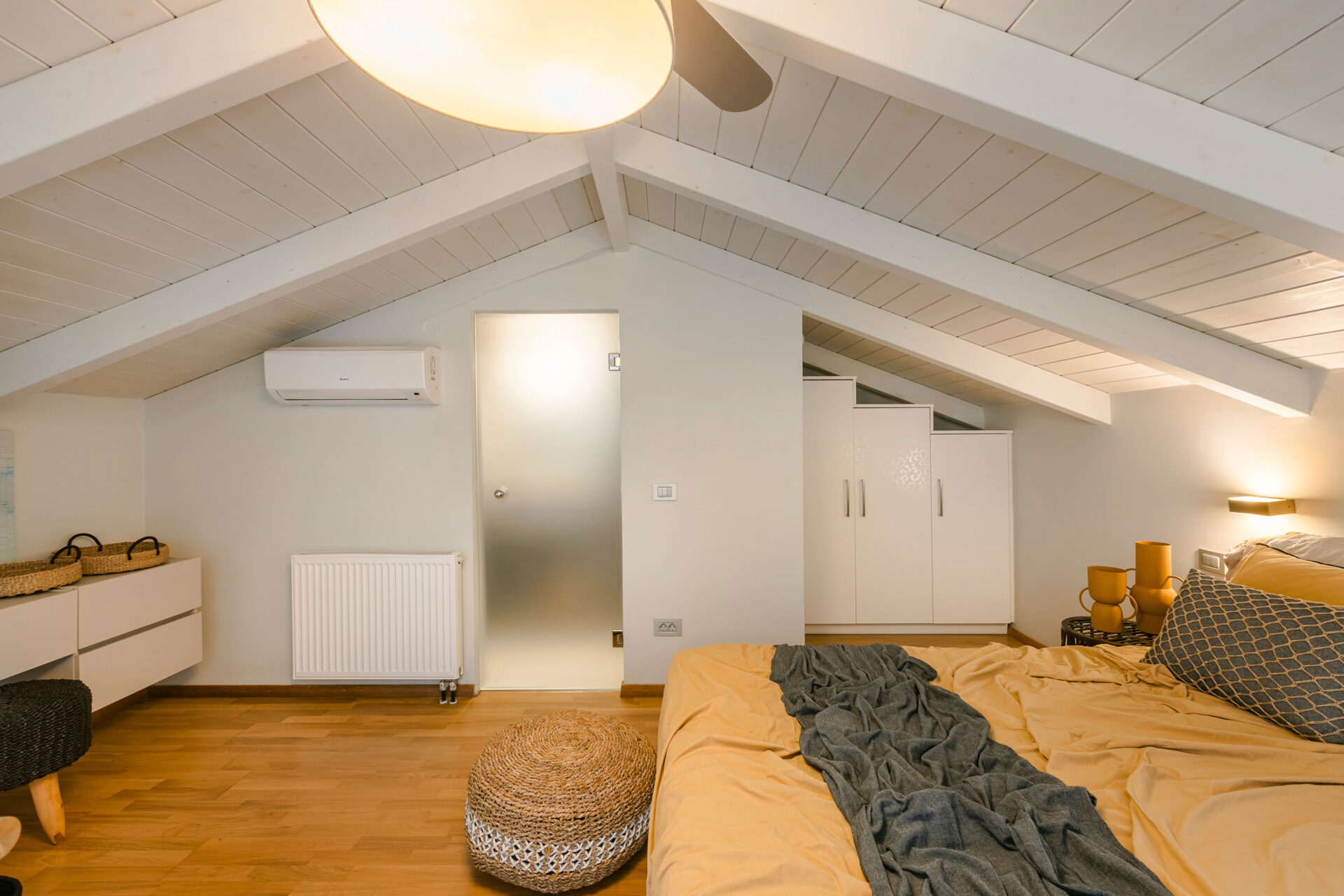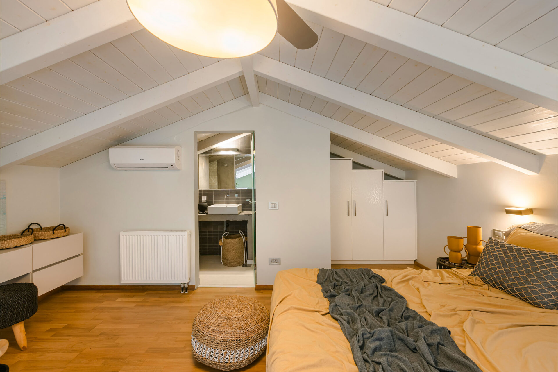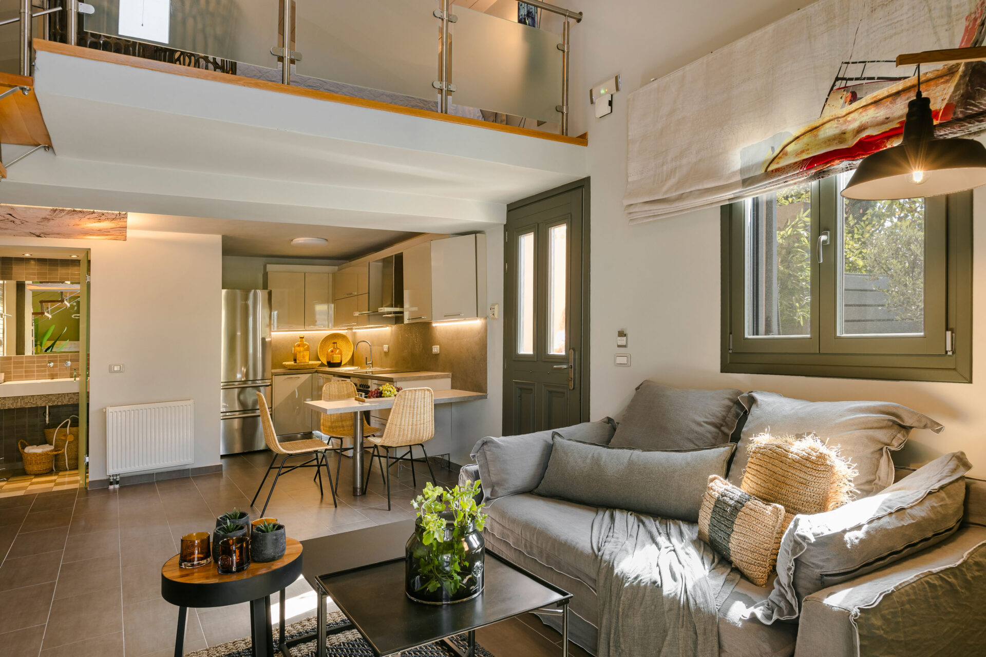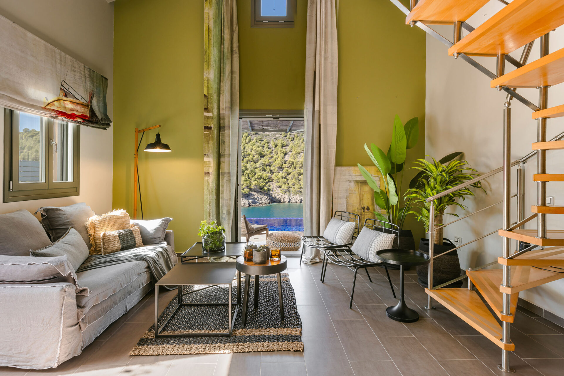 A wide staircase leads to the attic bedroom, where guests will find a comfortable double bed, elegant furnishings, a wardrobe, and a second modern shower room. Every corner of Villa Eutixia reflects thoughtful design and an inviting sense of intimacy.
