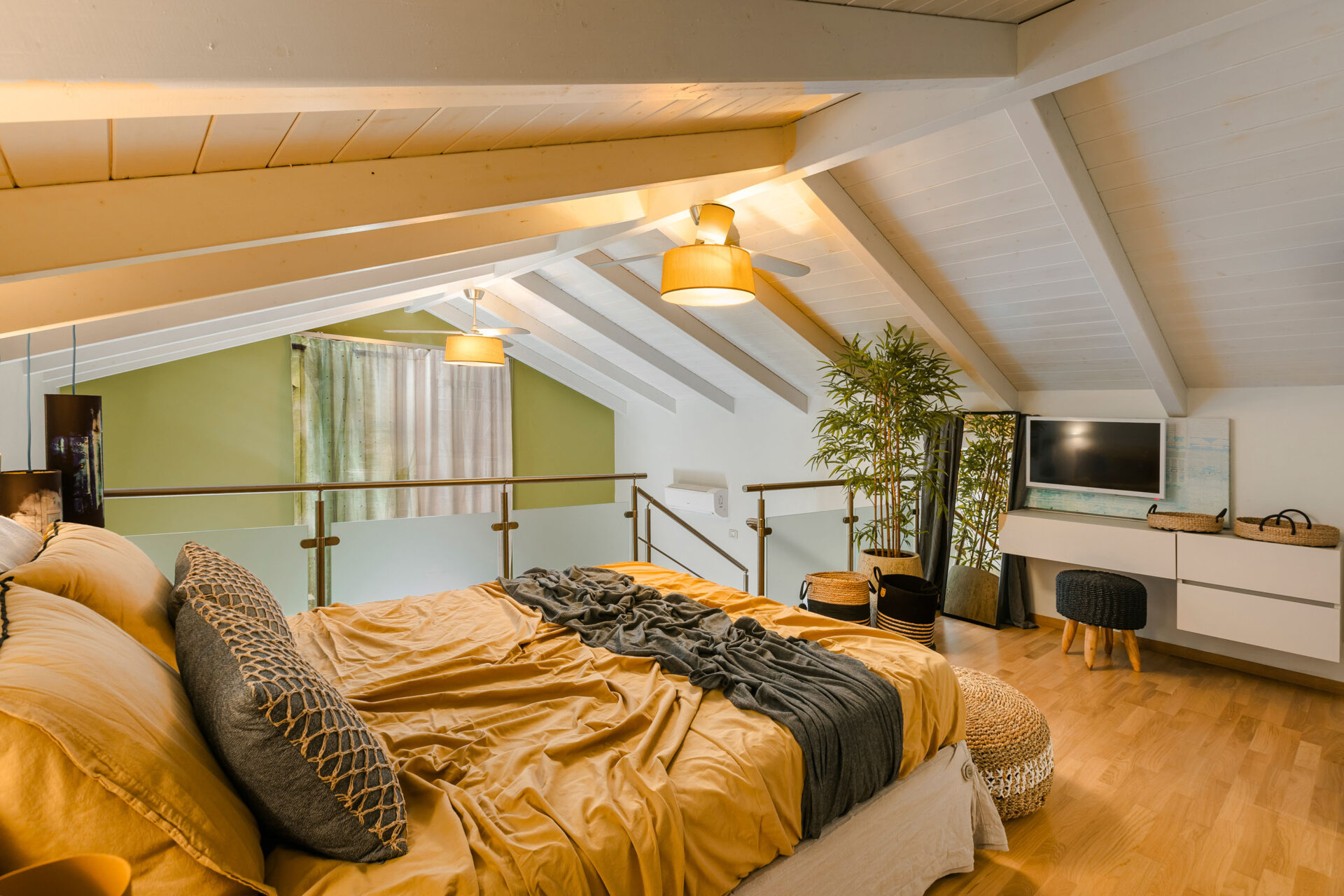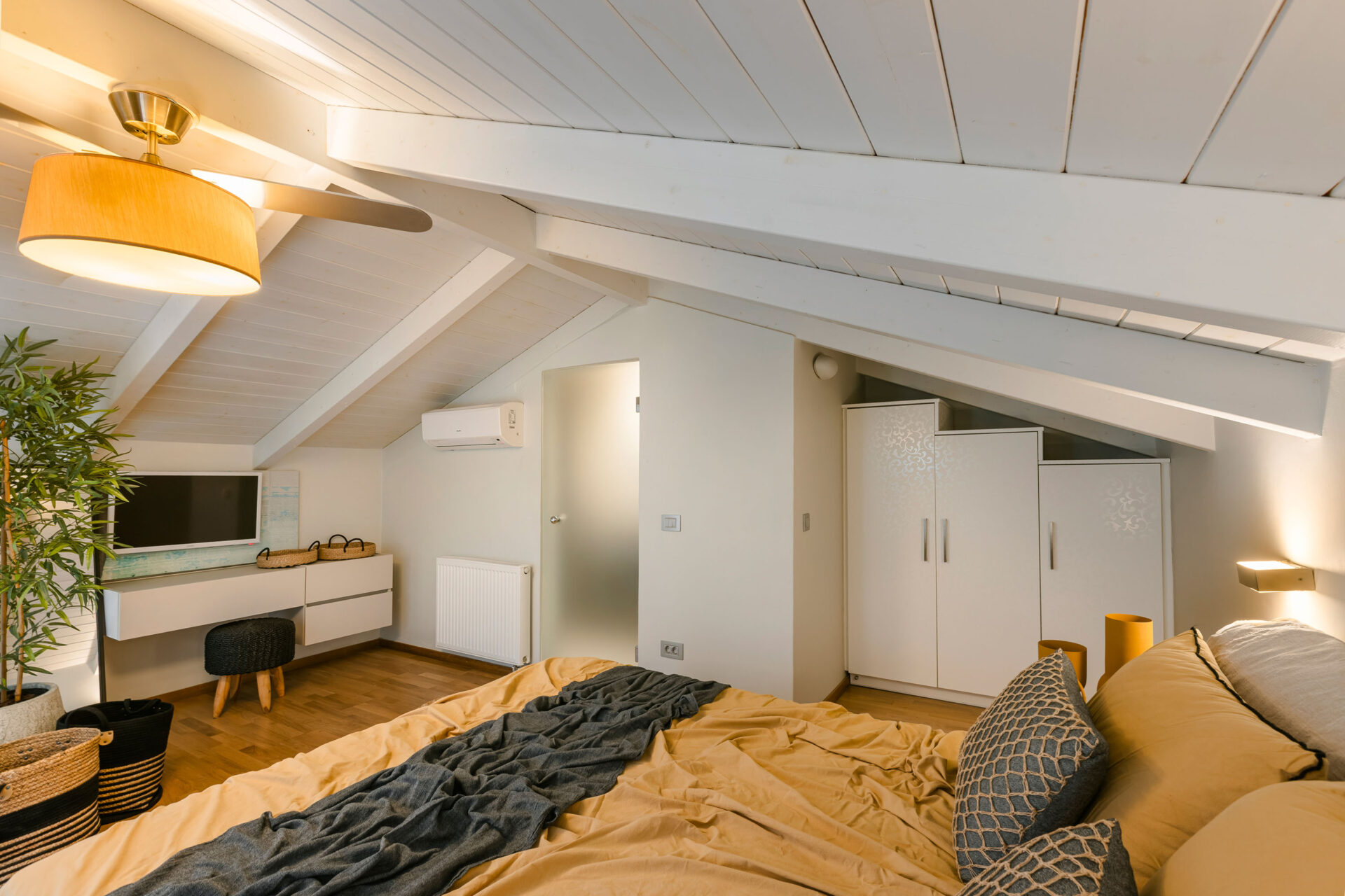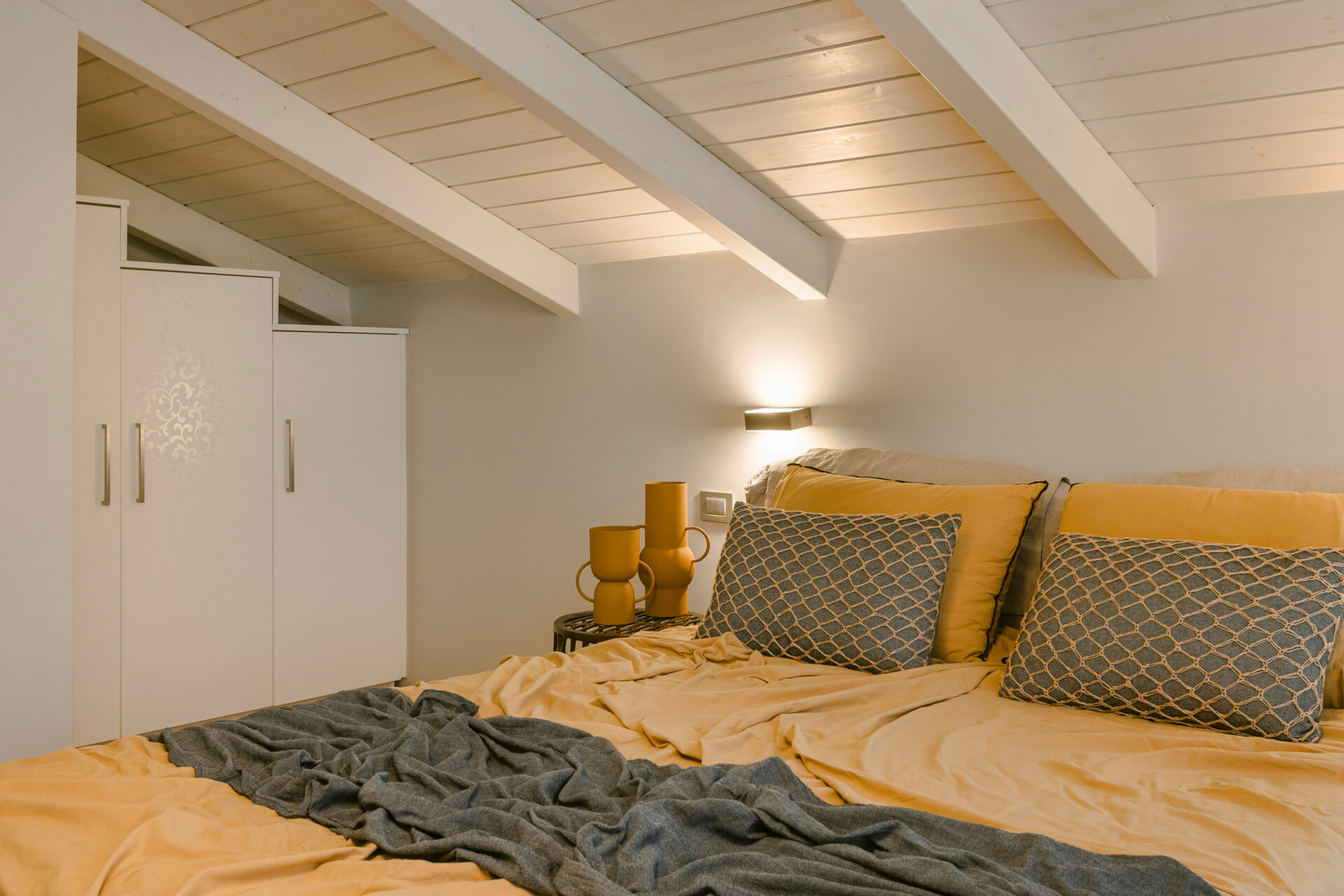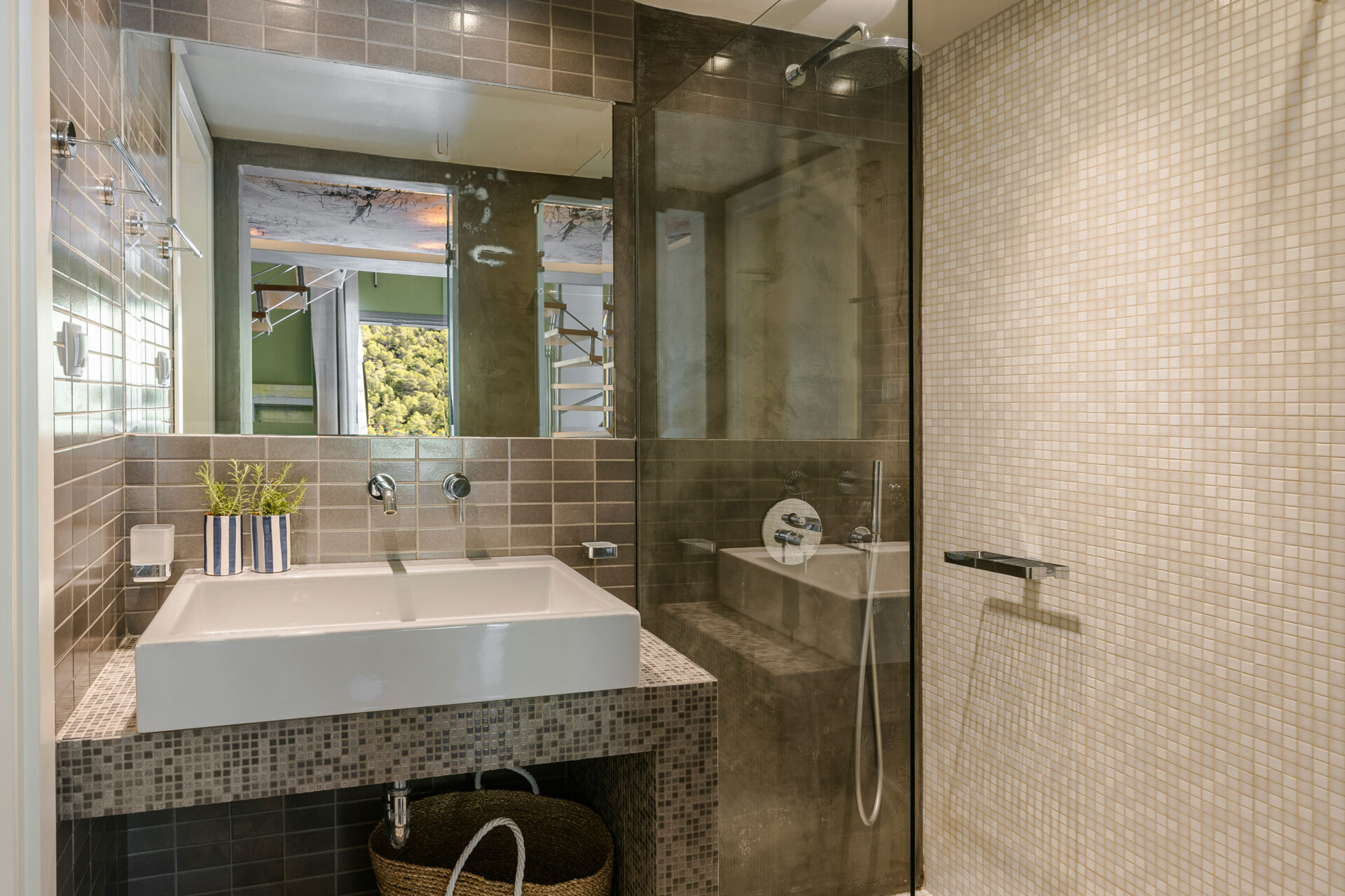 A wide staircase leads to the attic bedroom, where guests will find a comfortable double bed, elegant furnishings, a wardrobe, and a second modern shower room. Every corner of Villa Eutixia reflects thoughtful design and an inviting sense of intimacy.