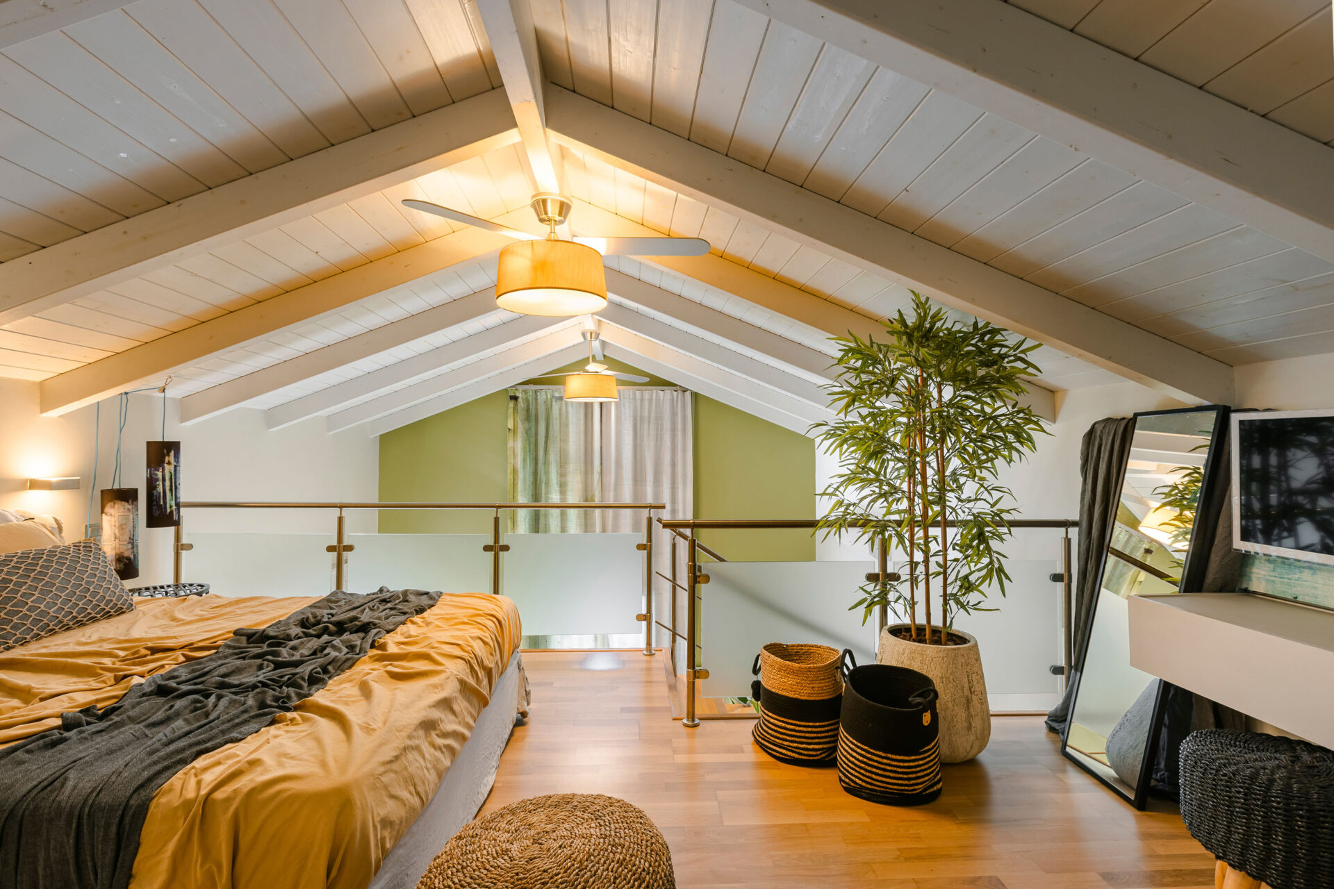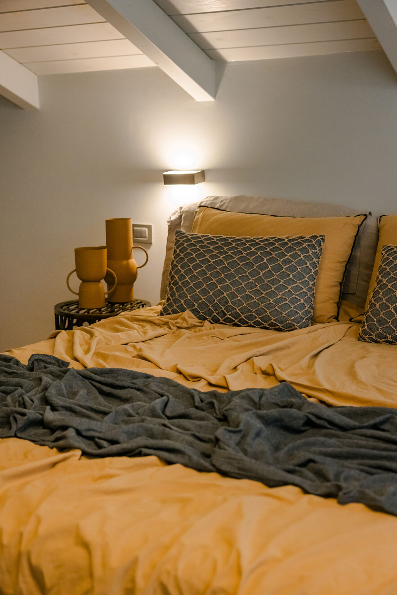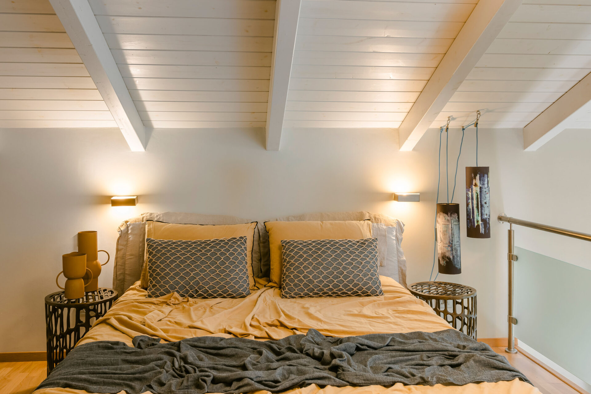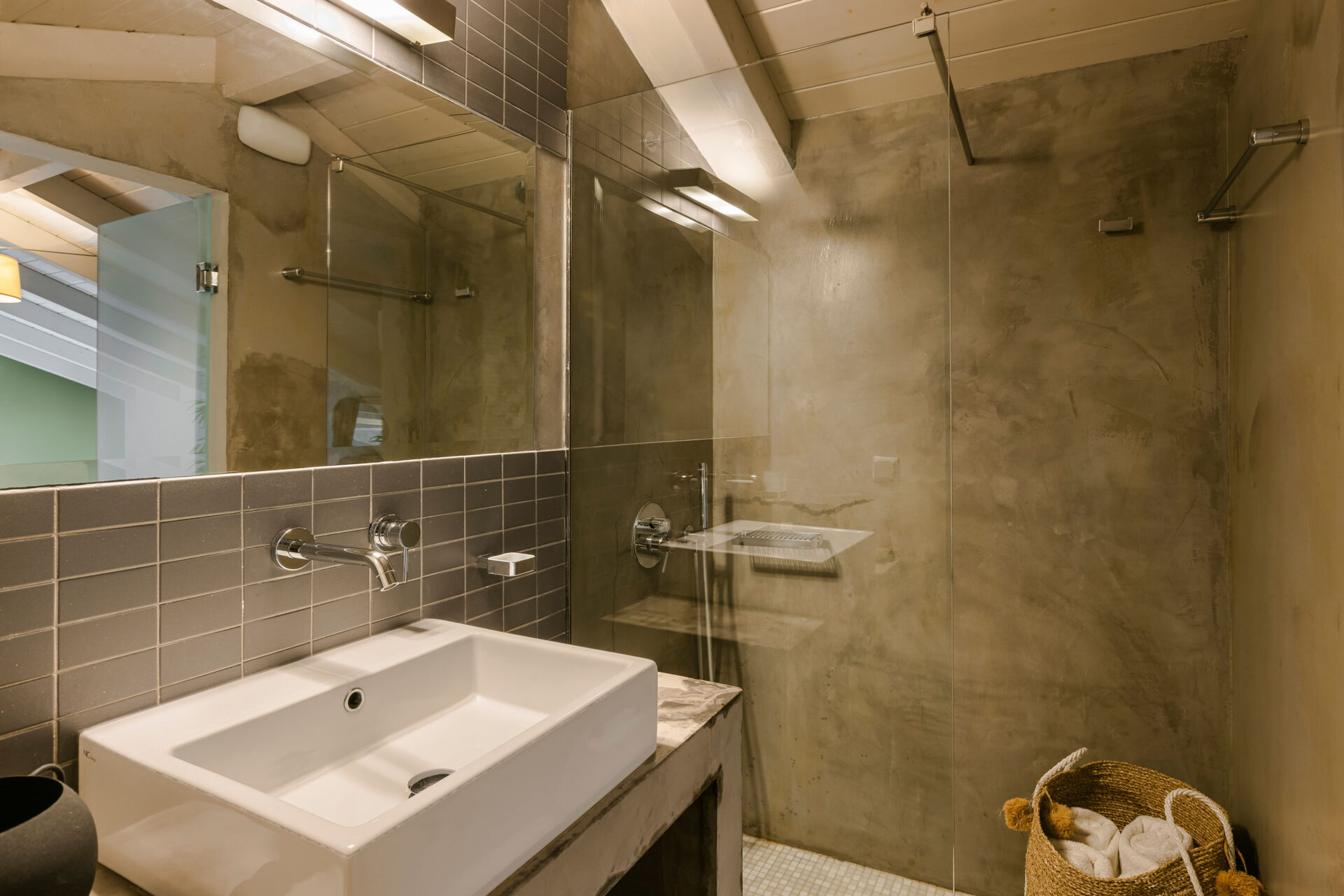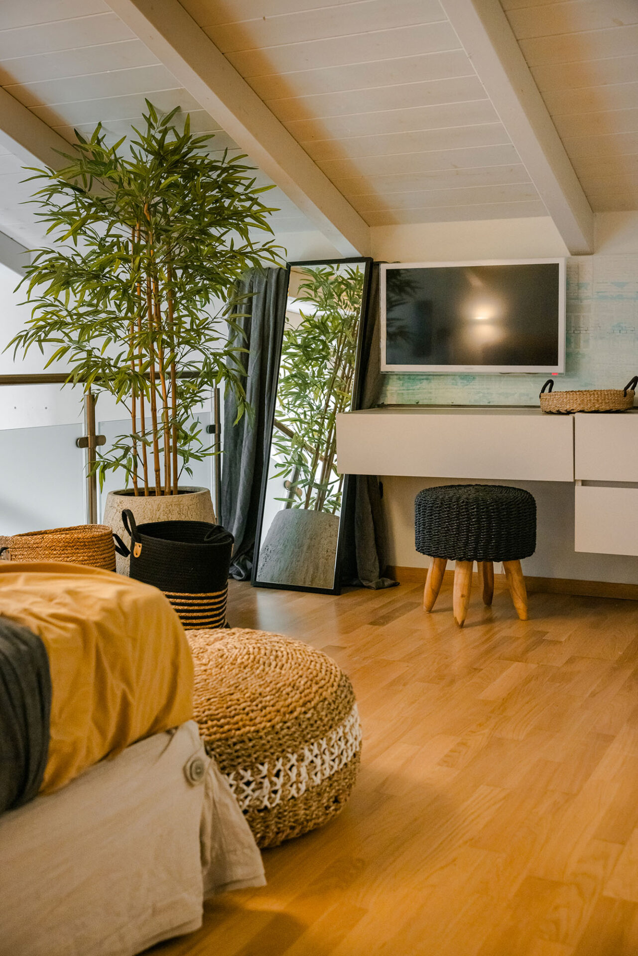 A wide staircase leads to the attic bedroom, where guests will find a comfortable double bed, elegant furnishings, a wardrobe, and a second modern shower room. Every corner of Villa Eutixia reflects thoughtful design and an inviting sense of intimacy.