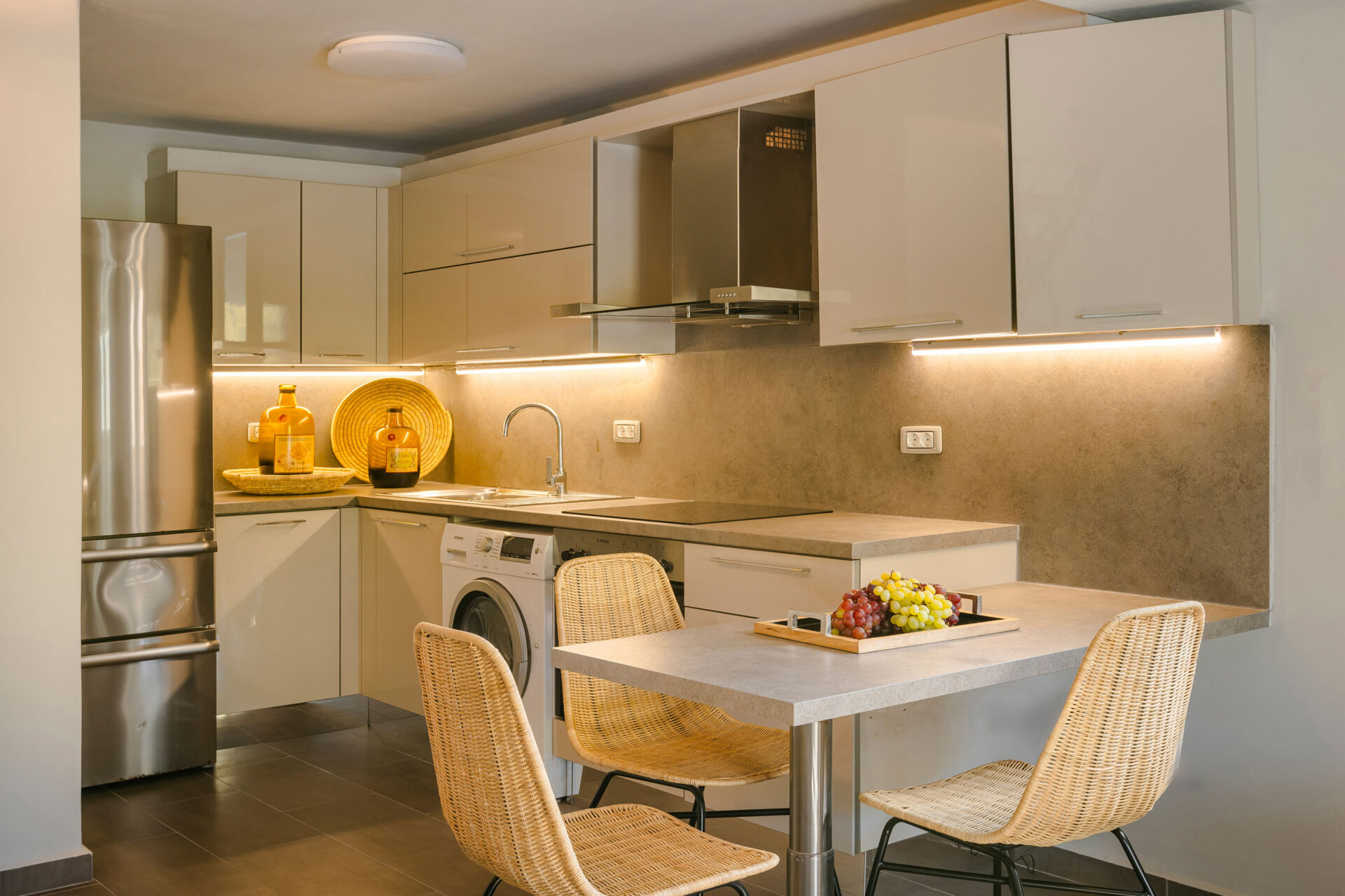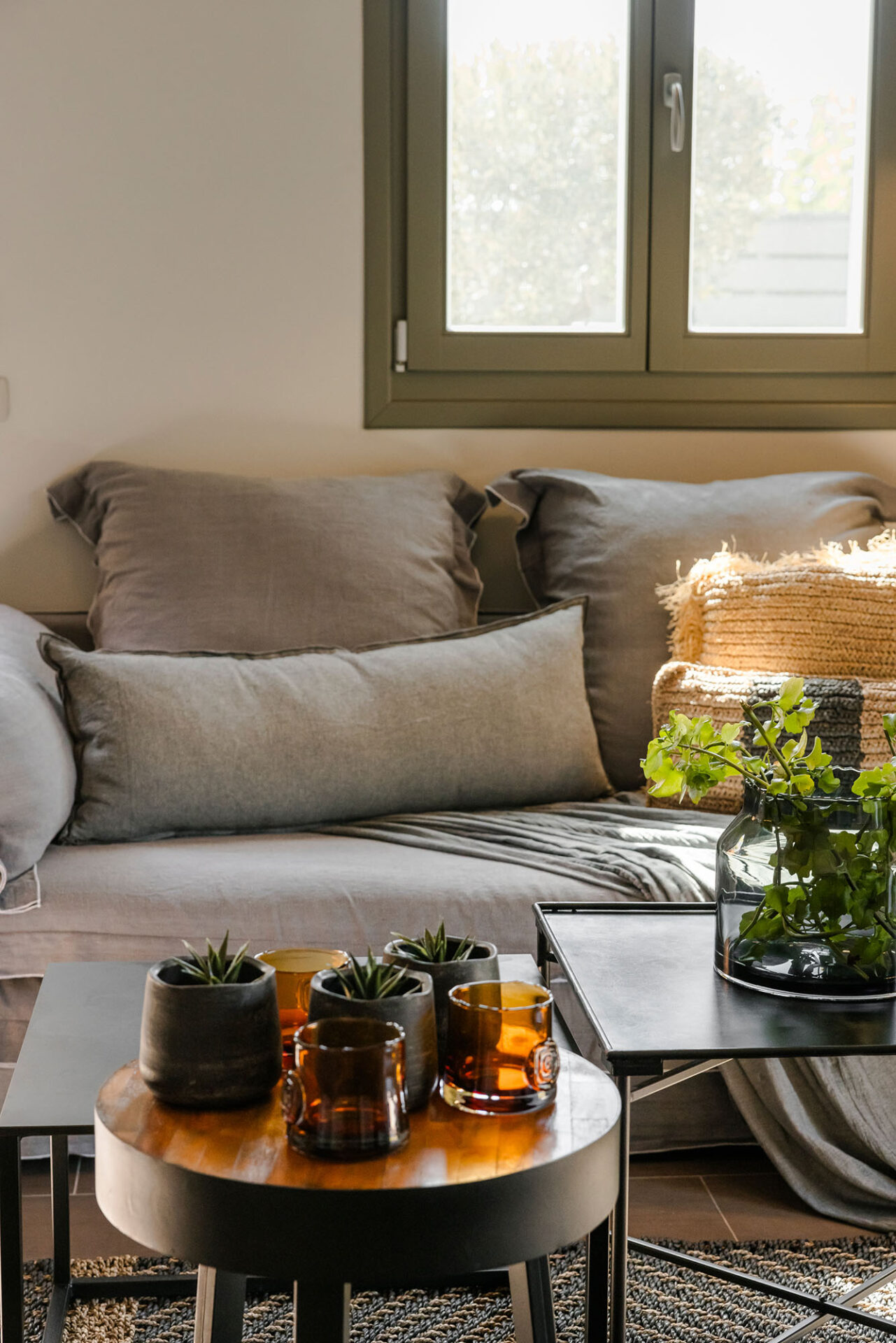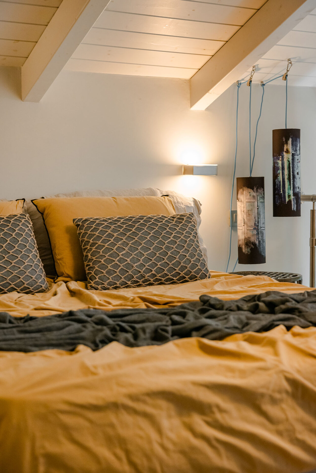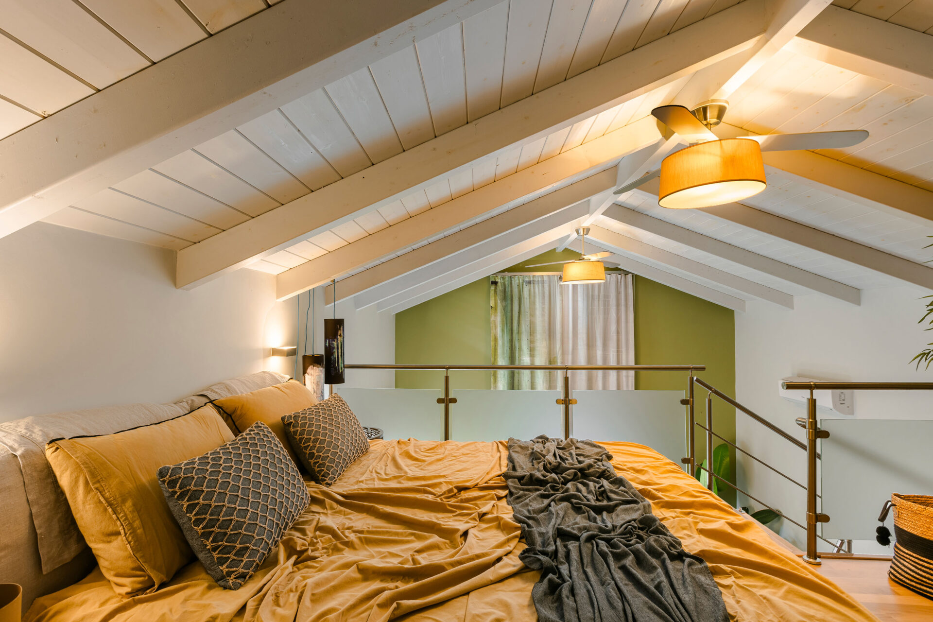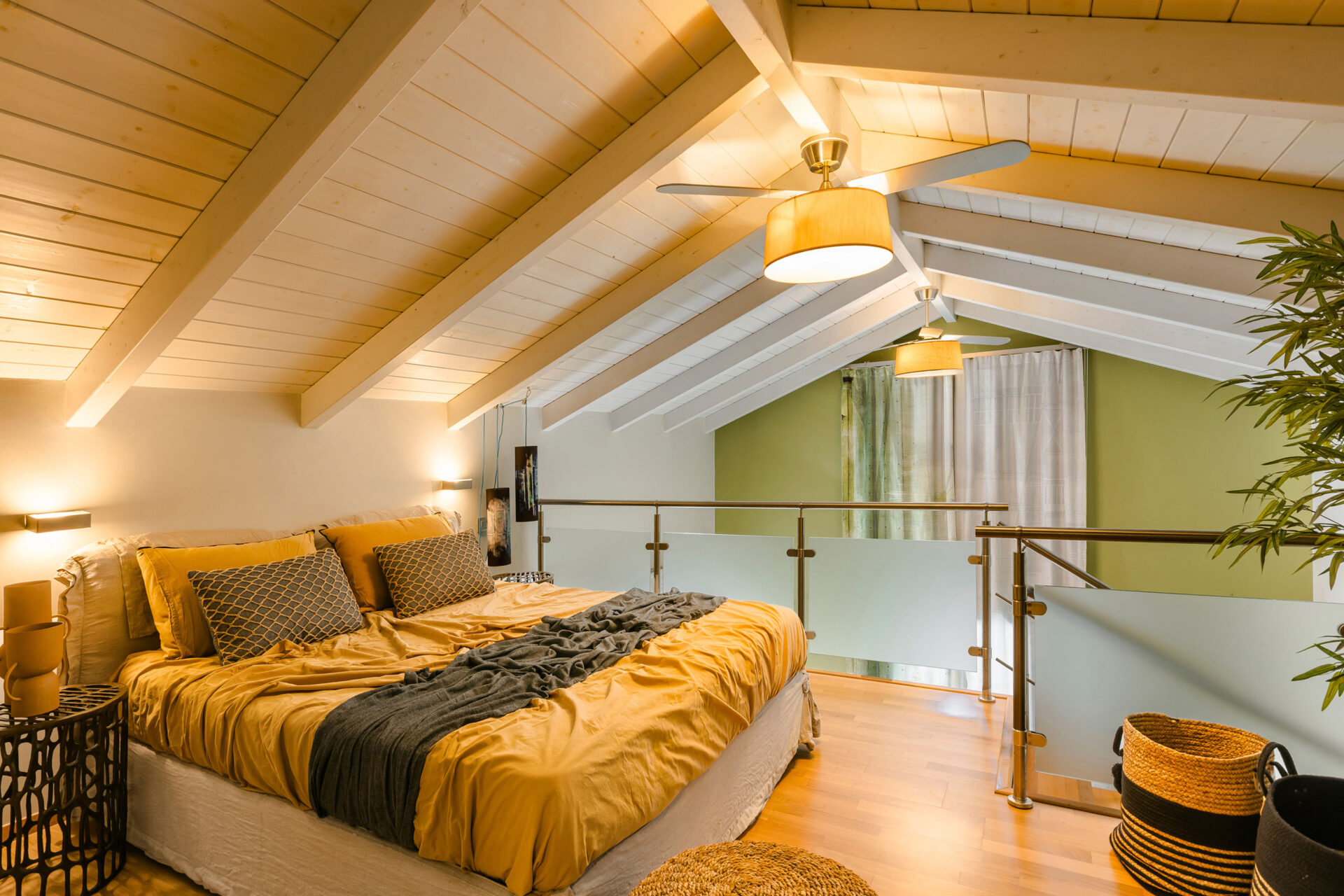 A wide staircase leads to the attic bedroom, where guests will find a comfortable double bed, elegant furnishings, a wardrobe, and a second modern shower room. Every corner of Villa Eutixia reflects thoughtful design and an inviting sense of intimacy.