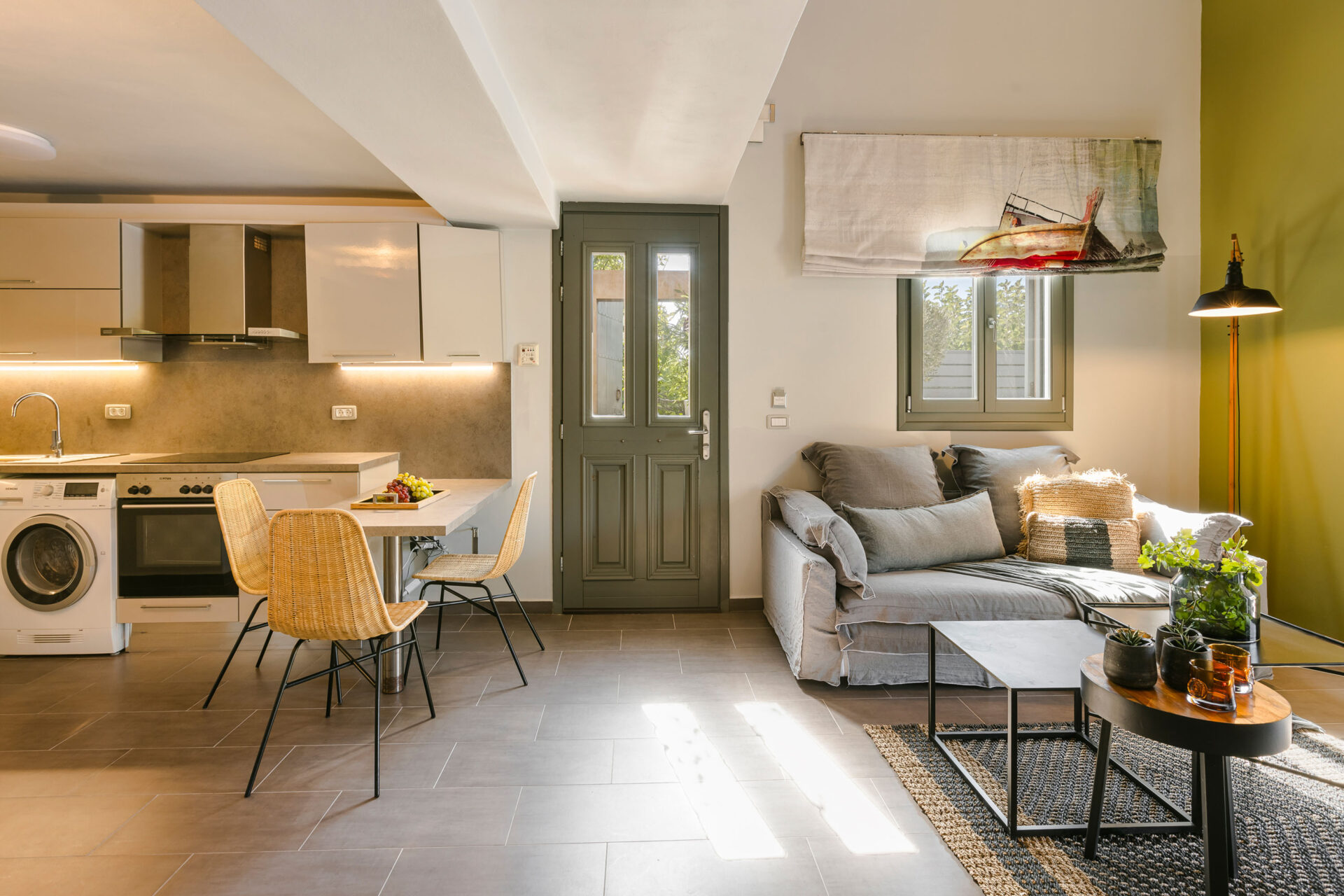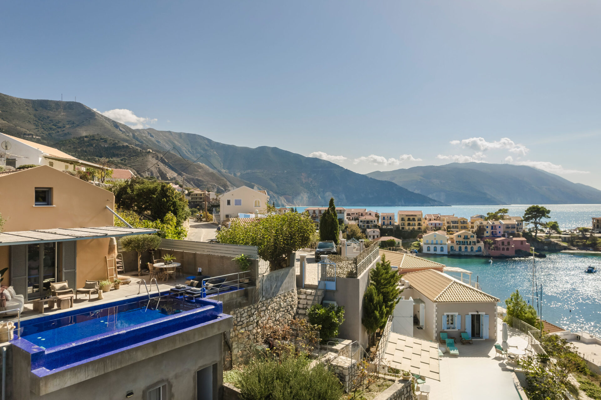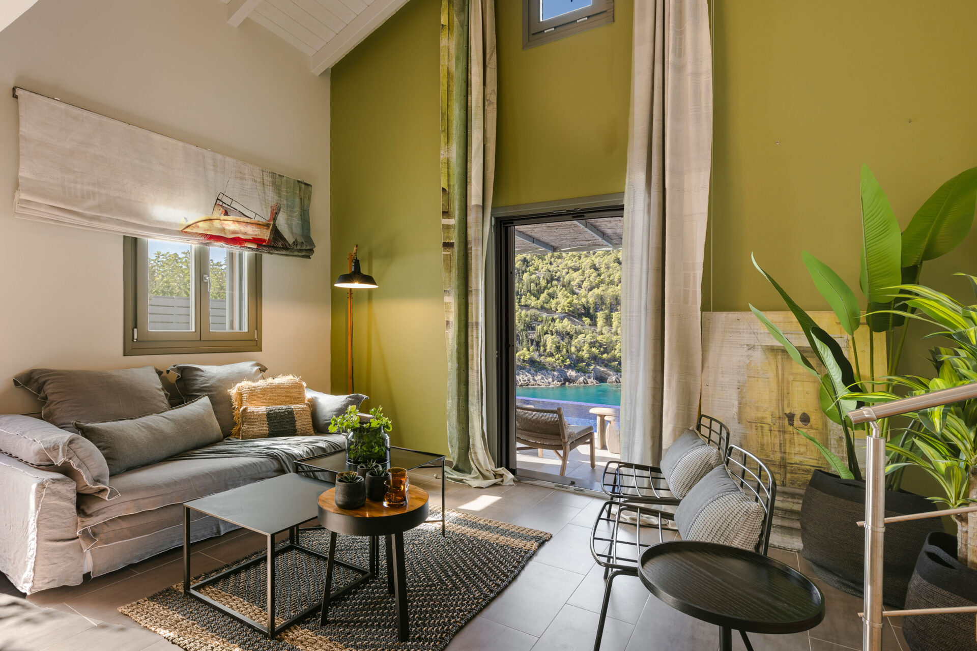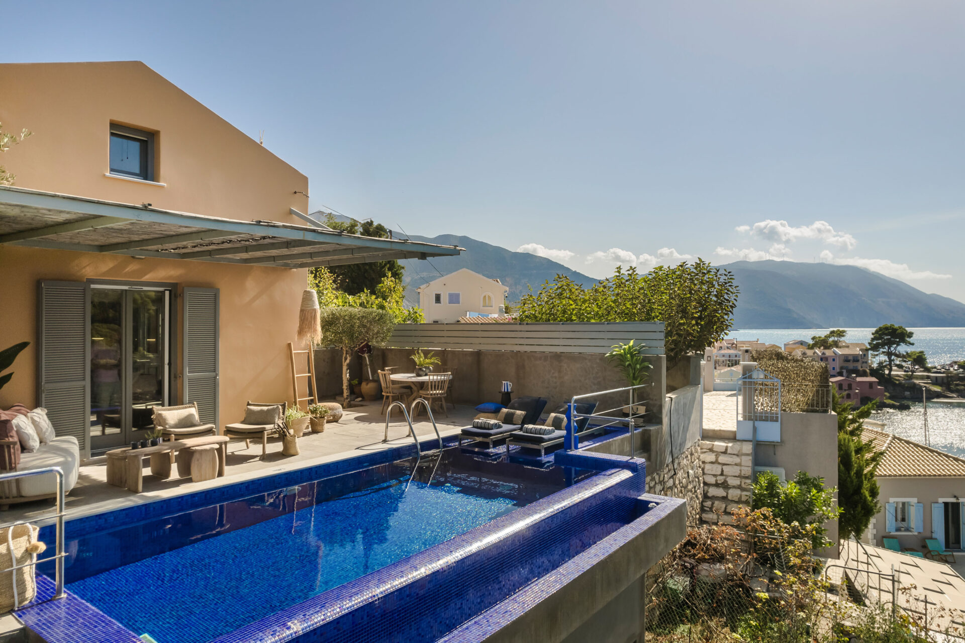 Step onto the sun-drenched terrace and enjoy sweeping views of the Ionian Sea and the historic Assos Castle in the distance. Savor al fresco dining as the sunset paints the sky in shades of gold and crimson. Listen to the gentle rhythm of the waves just below and feel the calm of true island living.