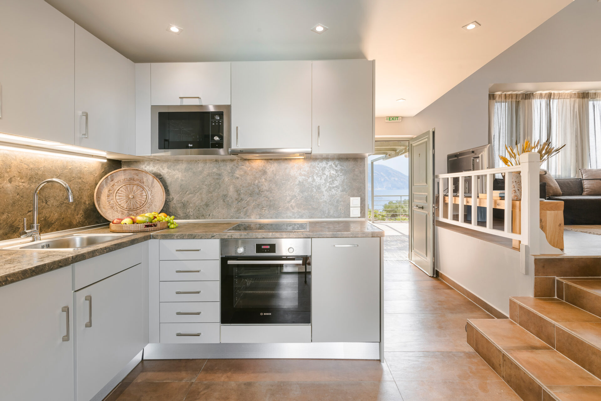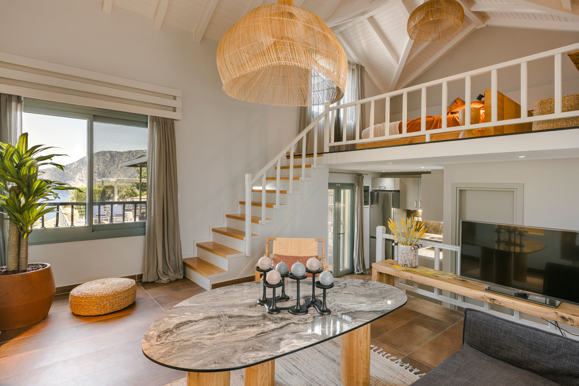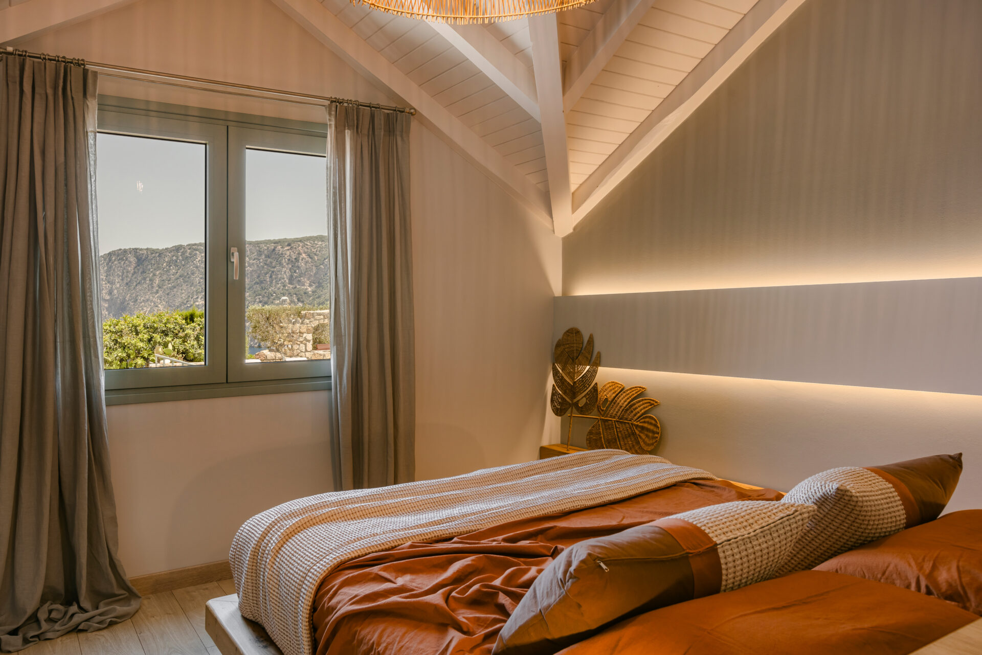 Inside this charming Kefalonia villa, comfort meets coastal elegance in a bright open-plan living and dining area, enhanced by large windows that fill the space with natural light and refreshing air. The fully equipped kitchen opens directly onto the terrace, making outdoor meals both effortless and enjoyable. The ground-floor twin bedroom offers seamless indoor–outdoor living with its private balcony, while the attic master bedroom provides peaceful seclusion and sweeping views of the Ionian Sea.